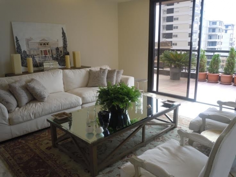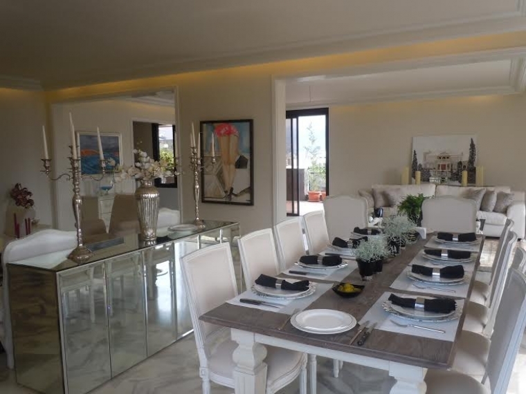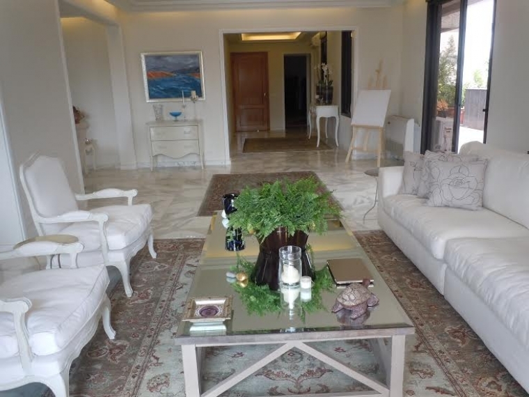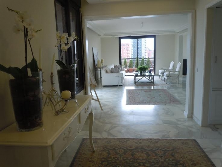 The terrace surrounds the apartment 360 degrees. 3 master bedrooms, each with a bathroom. 1 living room, kitchen, 2 salons, 1 dining, storage room. Internet connection, parking for 1 car, split system in each room. Very nice view.